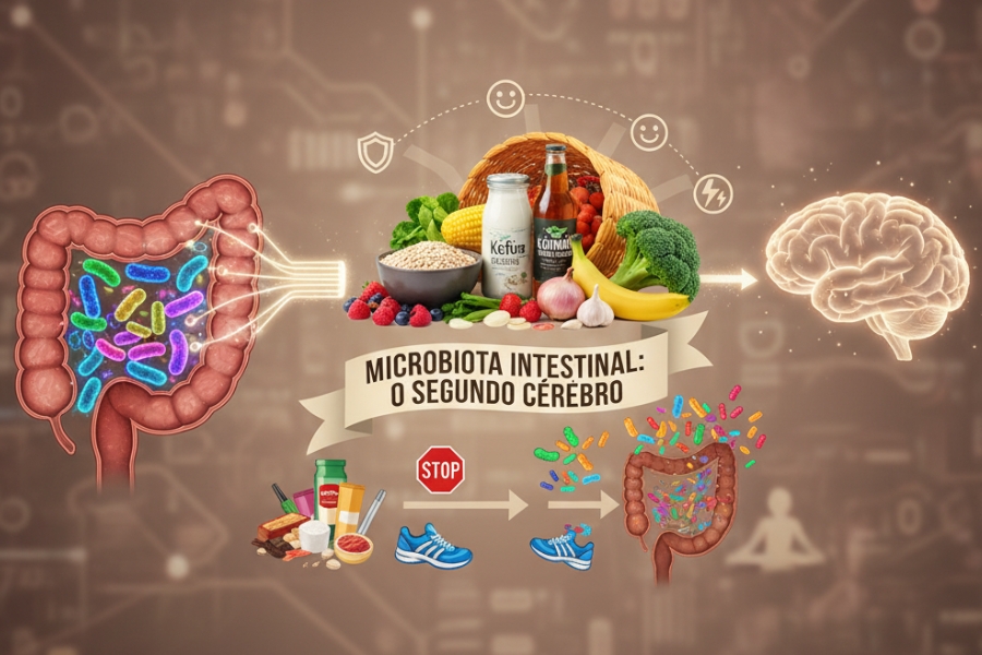 A conexão entre o intestino e o cérebro é conhecida como eixo intestino-cérebro. Sua microbiota produz substâncias neuroativas, como a serotonina (o “hormônio da felicidade”), que influenciam o humor, o estresse e a ansiedade. A comunicação é de mão dupla: o cérebro afeta o intestino (é por isso que o estresse pode causar dor de estômago), e a saúde intestinal pode influenciar o seu estado mental. Uma microbiota desequilibrada tem sido associada a distúrbios como depressão e ansiedade.