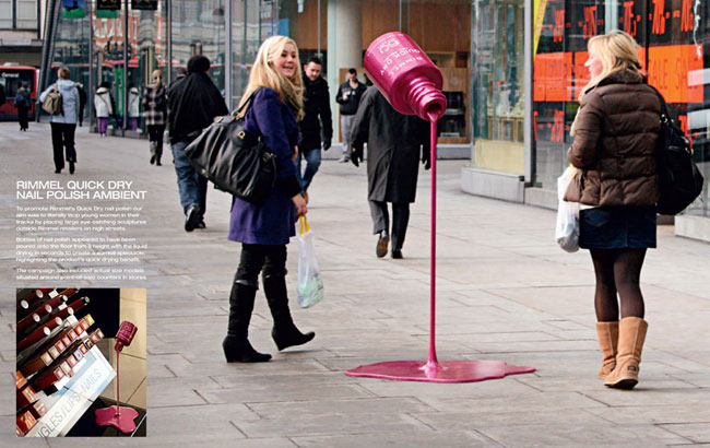 Criadas pela JWT de Londres, essas esculturas foram colocadas na rua para mostrar o principal atrativo do esmalte Rimmel Quick Dry, a secagem rápida. Nos balcões dos pontos de venda foram colocadas esculturas em tamanho real do produto.